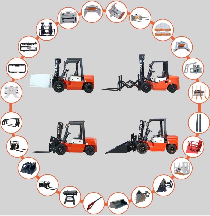 Motores, altura de elevación, neumáticos, horquillas, accesorios, etc., personalizados para satisfacer las necesidades del cliente.